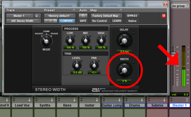 ▲附圖2: 加一個立體聲插件(Stereo Width Plugin)放在Master Track,並將Stereo Width設至零。留意,以上兩個方法都會將Master Track的左右聲量調至一樣水平(上圖紅箭咀)。這樣,以後簡單的bypass此插件便做到像mono button的效果。