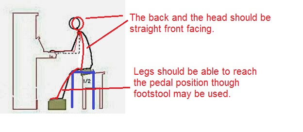 究竟坐一半還是2/3是因人而異。例如臀部較大,坐在較少的 ADJUSTABLE CHAIR (見附圖) 上可能已佔坐椅的2/3。重點是除了臀部,腳部能作支撐點,尤其使用踩踏板時,椅子不會向前傾,甚至反。長期只用臀部作為支撐點,要增加腰部負擔,導致坐了一段時間後,腰部不能垂直,嚴重則影響脊骨和神經。道理正如坐在工作椅上,不單單是臀部,也須要腳部支撐。