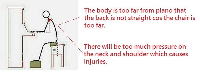 記得曾經有一位老師教導我彈漸大聲的時候,要把身體拉後啊! 漸細的時候,要向前啊! 考試的時候,要左右搖晃,令考官覺得很享受樂章。後來才發然這些動作是多如的,而且更有可能造成永久創傷。例如彈奏大聲的時候要運力,強行把身體拉後會傷害手臂和手根。反之,把身體傾前,更有效使用臂力,此乃地心吸力原理。至於向左或向右,就應視乎向高音域還是低音域移動來調較。一些擺動都應順其自然,不應強行把身體移到某位置或強行不移動身體去調較。