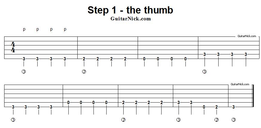 首先的第一個練習我們先練習右手大拇指(譜寫為P)彈奏第5線和第6線,左手用2(中指)及3(無名指)手指按弦,而譜上最低的一條線我們稱為第6線,最高的我們稱為第1線如此類推,線上寫著的數字是我們要用左手手指按弦的格數,而下方有圖形圈著的數字即代表我們要用那一支手指按弦。如線上寫著3而下方圈著數字又是3的話,即是我們要用3手指按第3格彈奏。