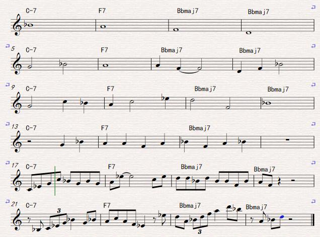 為什麼用伴奏練比較好,因為配上伴奏,能幫助你聽出和聲效果。如果沒有人伴奏,你玩的Eb就是Eb。但如果有人在玩C-7,那你的Eb就是minor 3rd了,有minor 3rd該有的聲音和效果,這些和聲效果都要靠練習的時候慢慢去感受、體驗、聆聽,慢慢找出自己的喜好。又要演奏,又要去想,還要靜心聆聽,所以要再強調,先不要弄一些太難的樂句,先一切從簡!