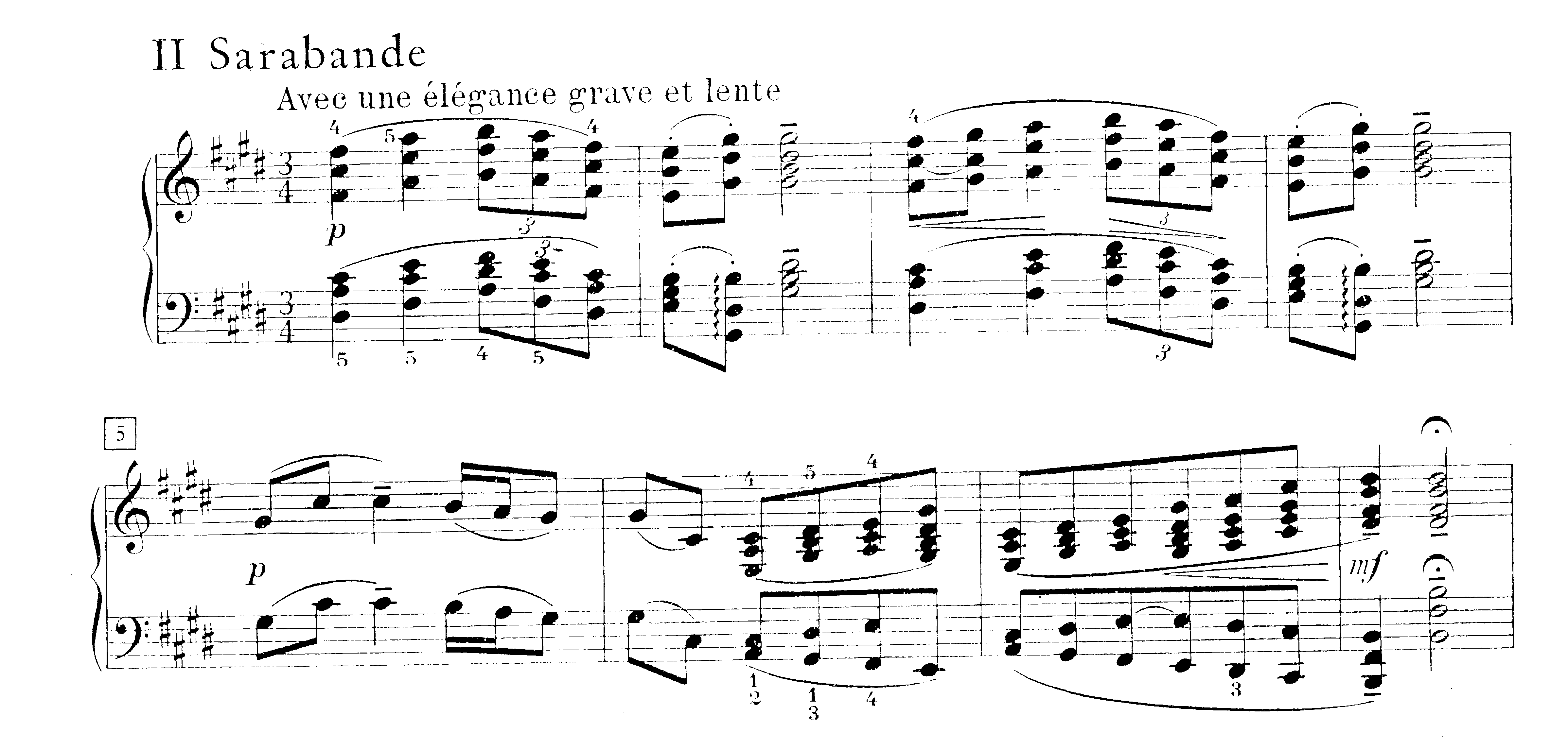 可是讀者會看到以下的樂譜,由第一小節便已不斷出現「平行五度」的和弦進行,而且結構也很一致,好明顯不是作曲家寫錯了,而是故意這樣寫。那到底這首樂曲是否算是古典音樂呢?它又是甚麼樂派的作品呢?