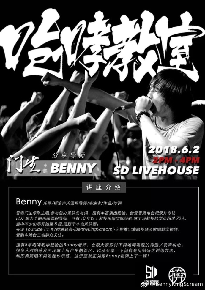 2018年在廣州及佛山舉辦「Benny King咆哮唱法講座分享會」。
