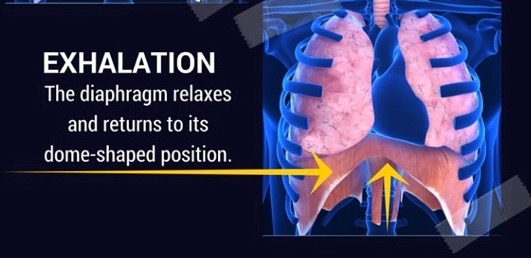 橫隔膜隨即被向下壓,令肺部有更大空間儲存空氣供給我們唱歌之用,胸骨架、腹部此時會向外膨脹。