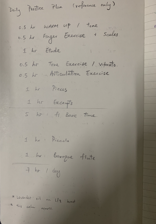 如果係音樂系學生,每天基本需要5-6小時既練習,那麼可考慮分成3個2小時練習block。早上2小時作warm-up和技巧訓練,下午2小時可作練習曲和樂曲練習,到最後一節可能練下餘下的東西或聽聽錄音和研究一下鋼琴伴奏樂譜。(當然,咁係理想狀態,喺香港每分每秒都係咁忙碌既社活的確有啲難,可能到外國讀書或者住喺郊區啲就可以有尼個習慣)