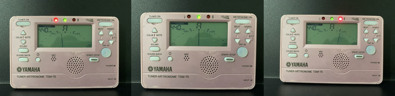 要知樂器啱唔啱音,最基本就係用調音器 (tuner)。相信小朋友自從得知尼個世界上有調音器之後,佢地知道既就係綠燈就等於啱音。尼件事本質無錯,因為調音器結構上係咁樣用。當接收到某一個聲音,佢就會找出相應最接近既頻率(frequency),然後透過紅綠燈話你知你同應該既頻率相差了多少。左邊紅燈代表太低 (flat),右邊紅燈就代表太高 (sharp),中間綠燈代表”啱音”。